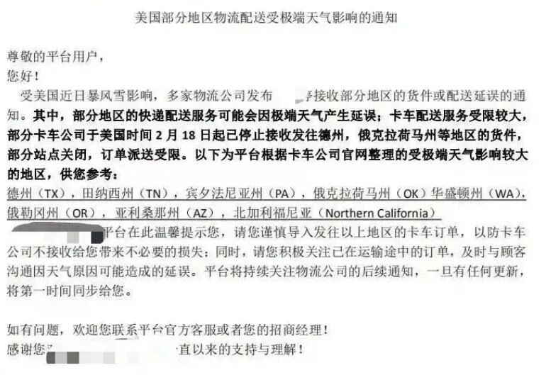 卡車配送服務受限較大,部分卡車公司于美國時間2月18日起已臨時停止接收發往德州,俄克拉荷馬州等地區的貨件,部分站點關閉,訂單派送受限。